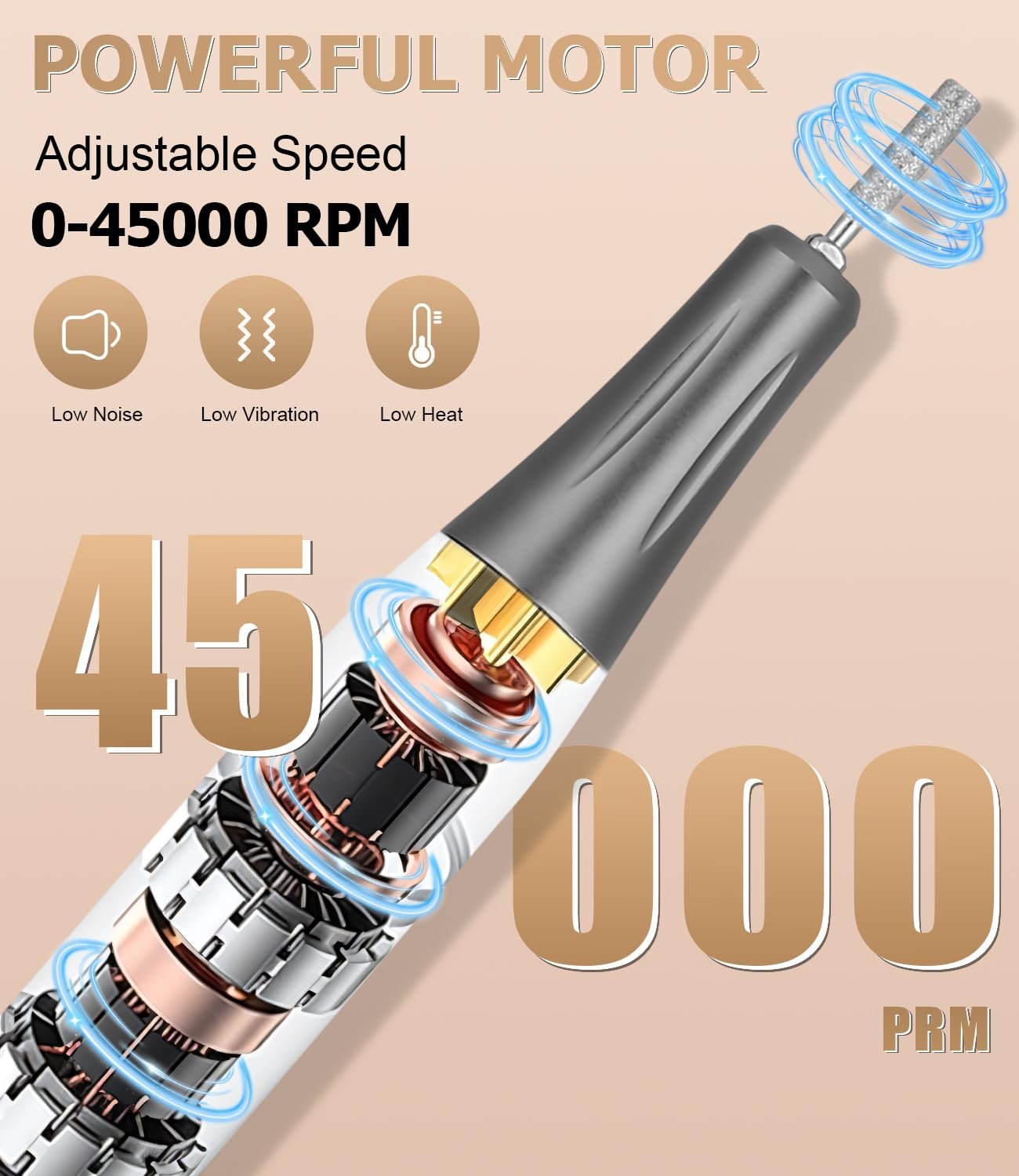 - [Powerful Motor] Our gel nail cutter is durable, low heat, low noise and low vibration, and the maximum speed can reach 45,000RPM. The aluminium alloy body and ventilation holes prevent the phone from overheating. The lightweight and ergonomic design makes it comfortable to use. Twist lock chuck for easy drill changes. A good tool buddy allows you to enjoy a beautiful manicure journey in any situation without disturbing anyone.