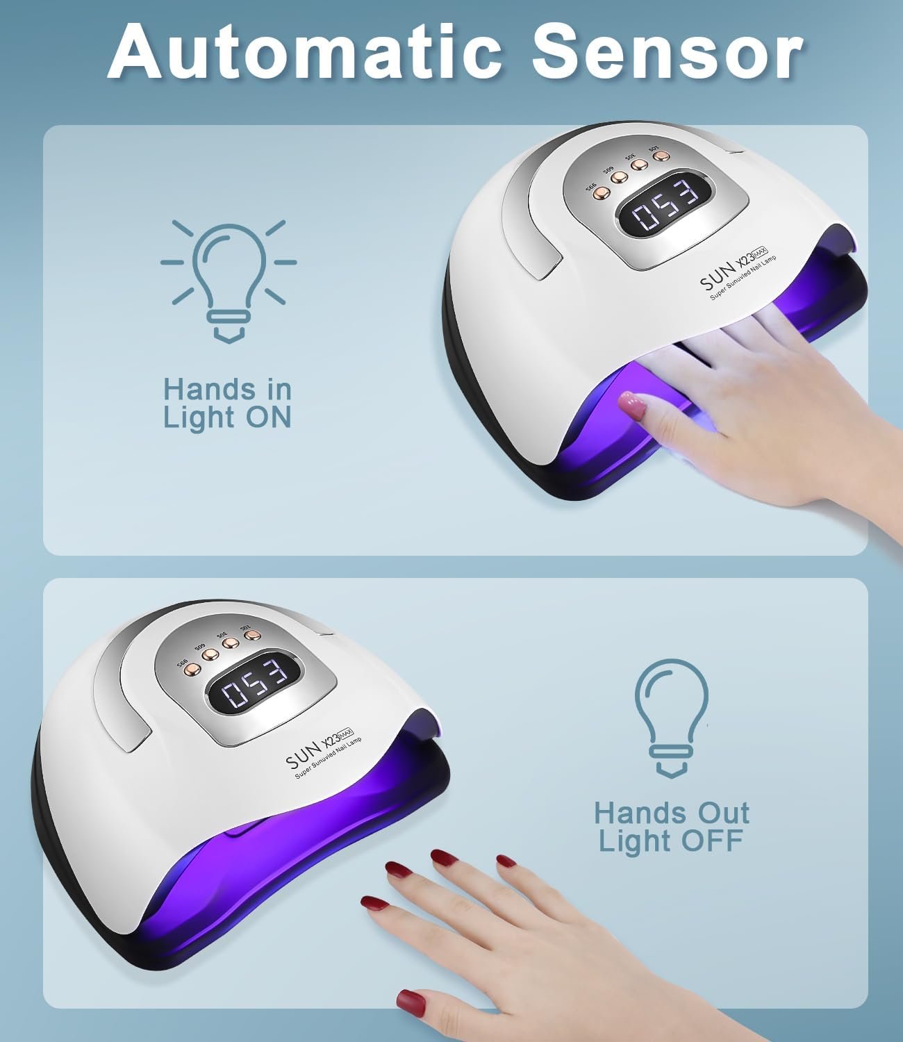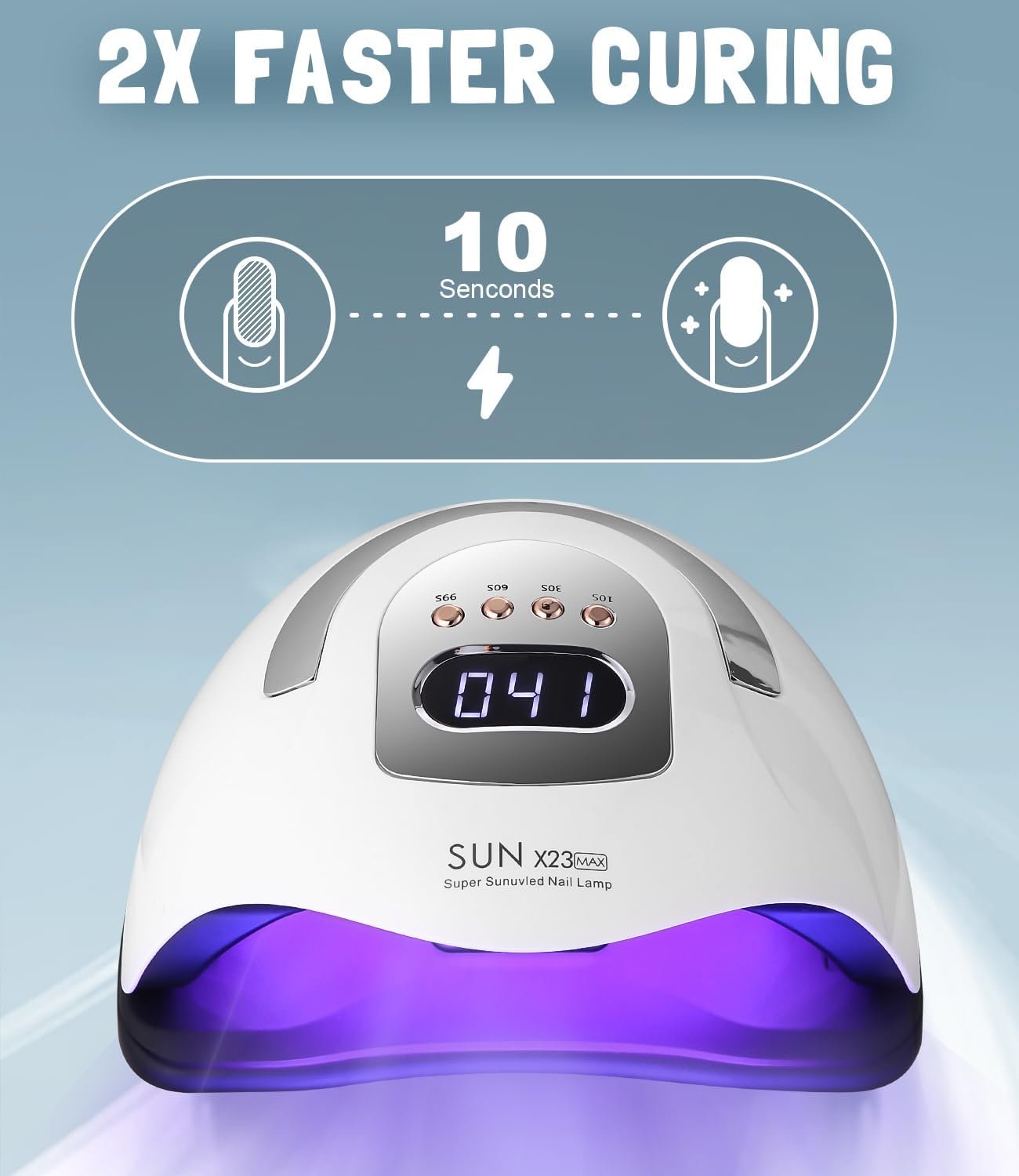 Double drying speed: Equipped with 81 durable LED lamp beads, the service life is 50,000 hours. 380 W power, quick drying, compared to other dryers, the drying efficiency is twice as high. Does not harm your eyes and skin like the outdated nail polish dryer.